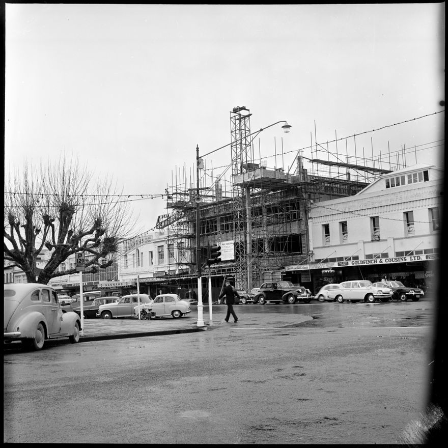- This image was taken for a story that ran in The Manawatu Evening Standard on 3 July, 1963. "With the rapid expansion which is at present taking place in the city, the construction of new buildings is inclined to be overlooked. With space becoming more and more of a problem, the buildings of necessity are going higher. The new insurance building in the Square is an example. At present a mass of scaffolding hides the three floors which have already been built with more to follow."