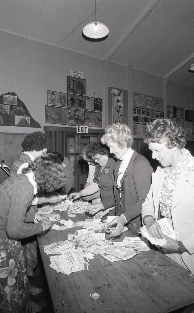 This image was taken for the Manawatū Evening Standard on 25th November 1978. Electoral officers count local ballots cast in the 1978 New Zealand General Election. Former Labour Member of Parliament Joseph Albert Walding regained the Palmerston North electorate with an election night majority of 2601.