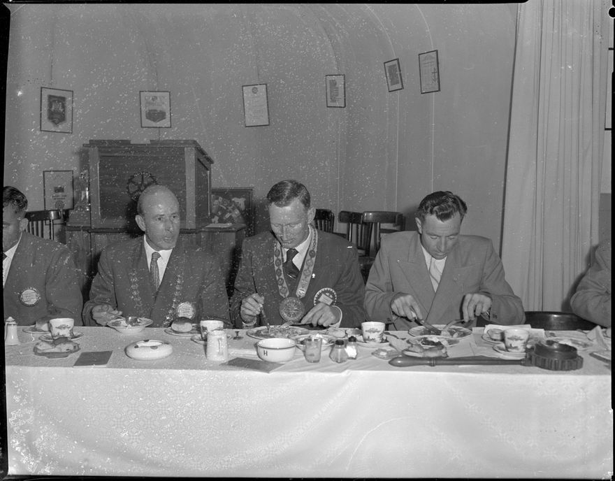 This image was taken for a story that ran in The Manawatu Evening Standard on 04 November 1958: "The District Governor (Mr. G. Kersicke) was the guest-speaker at the Palmerston North Rotary Club's meeting yesterday. At lunch were Mr. Kersicke, Mr. W. Thorrald Jaggard (the local president) and Mr. P.C.A. Collins (secretary)."