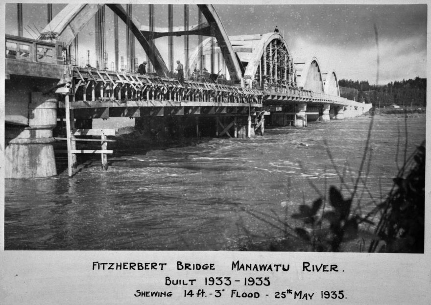 The Fitzherbert Bridge, Palmerston North was built over the Manawatu River during 1933-1935. The photograph shows the highest flood during construction, of 14ft on 25 May 1935.