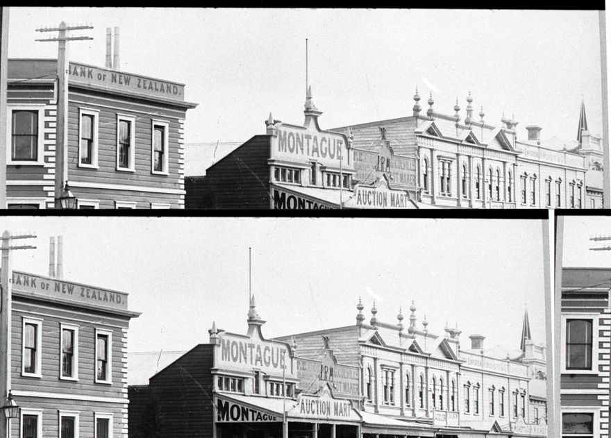 The Bank of New Zealand stood on the corner of Fitzherbert Avenue, while the two-story brick Colonial Bank (not visible) stood on the site of the old City Council Chambers (now Square Edge). The wooden buildings between these two banks were erected after the fire of April 1891, which destroyed four buildings previously standing on this site. This photograph was taken about the same time as sq 127 because the same buildings and signs appear in both photographs.