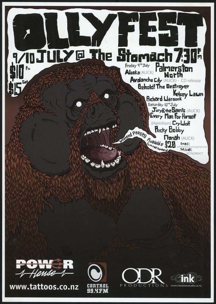 Ollyfest. 9/10 July@ The Stomach 7:30pm. $10 Fri, $15 Sat. Friday 9th July - Alaska, Avalanche City (AUK) (CD Release), Behold! The Destoyer, Kelsey Lawn, Richard Warnock. SATURDAY 10th July - Jury & The Saints (AUK), Every Man For Himself (Hamilton), Monah (AUK), Cry Wolf, Ricky Bobby. Weekend passes available (limited numbers) $20. Part of a collection of posters that were displayed at The Stomach, Lombard Street, venue for Creative Sounds Society Incorporated.