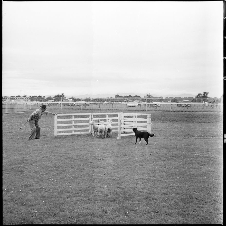 This image was taken for a story that ran in The Manawatu Evening Standard on 22nd January 1966 "Mr. F. Wilshire, of Pahiatua, and his bitch, Maid, delighted a large crowd with a near perfect run during the sheep-dog trials. Earlier in the day he completed another fine run with his older bitch, the mother of Maid. He is seen on the completion of his second run."