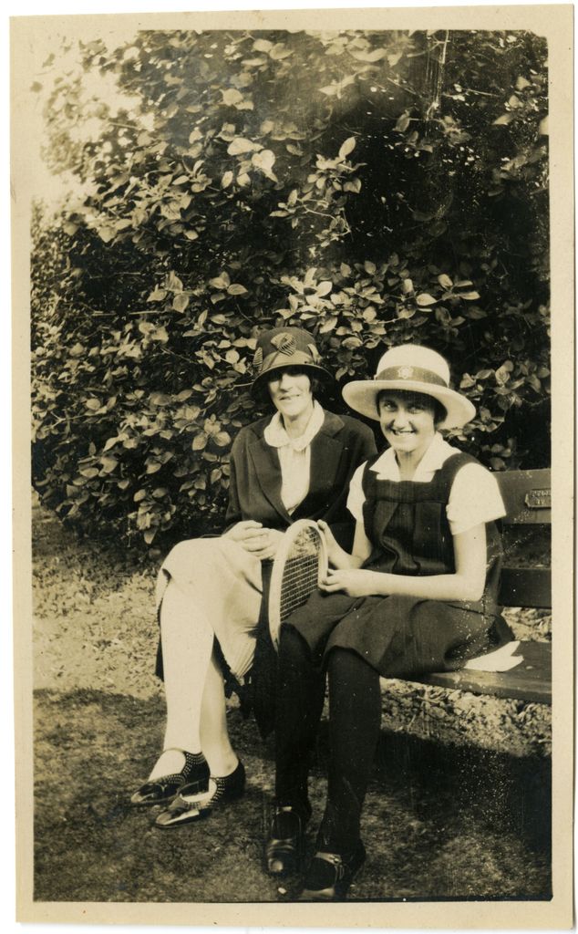 This photograph came from a small photograph album that belonged to Mrs R Andrews of Rangitikei House. This photograph bears the caption, "Marjorie and Self Esplanade April 6th 1928."