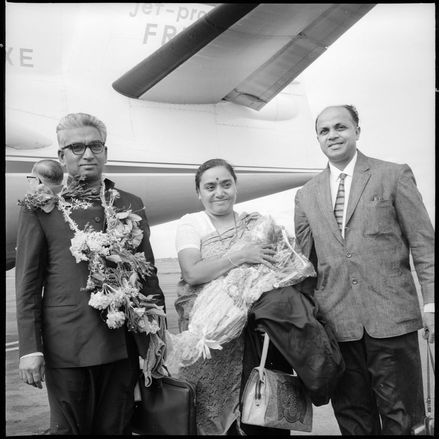 This image was taken for a story that ran in The Manawatu Evening Standard on 1st December 1965 "Dr. Anjana Mugar (right), a member of the Mahastra Legislative Assembly, and Mr. Harbans Lal, the Speaker of the House in the Punjab Legislative Assembly, at the Palmerston North Airport on Thursday last." {Third person not named]