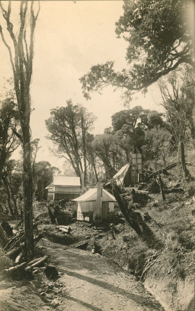 Shown here are several tent homes set near the access road. The tent to the right appears to have a chimney. The Mangahao Power Station provides hydroelectric power and is situated near the town of Shannon. It serves Wellington, Horowhenua, Taranaki, Hawkes Bay, and the Wairarapa. After being delayed by the first world war construction began in late 1919 and the station opened in November 1924.