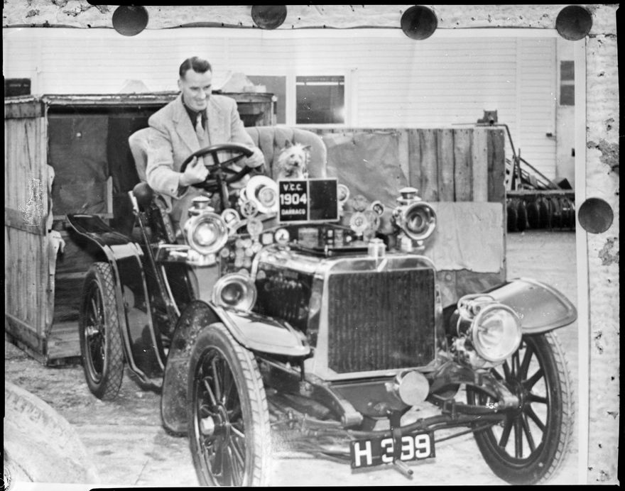 This image was taken for a story that ran in The Manawatu Evening Standard on 12 September 1958: "Genevieve, the world-famous car which will be remembered as the vehicle which was driven on the London to Brighton run in the film of the same name, and is at present in Feilding. In the photograph it is being driven for the first time in New Zealand by Mr. G.E. Gilltrap."
