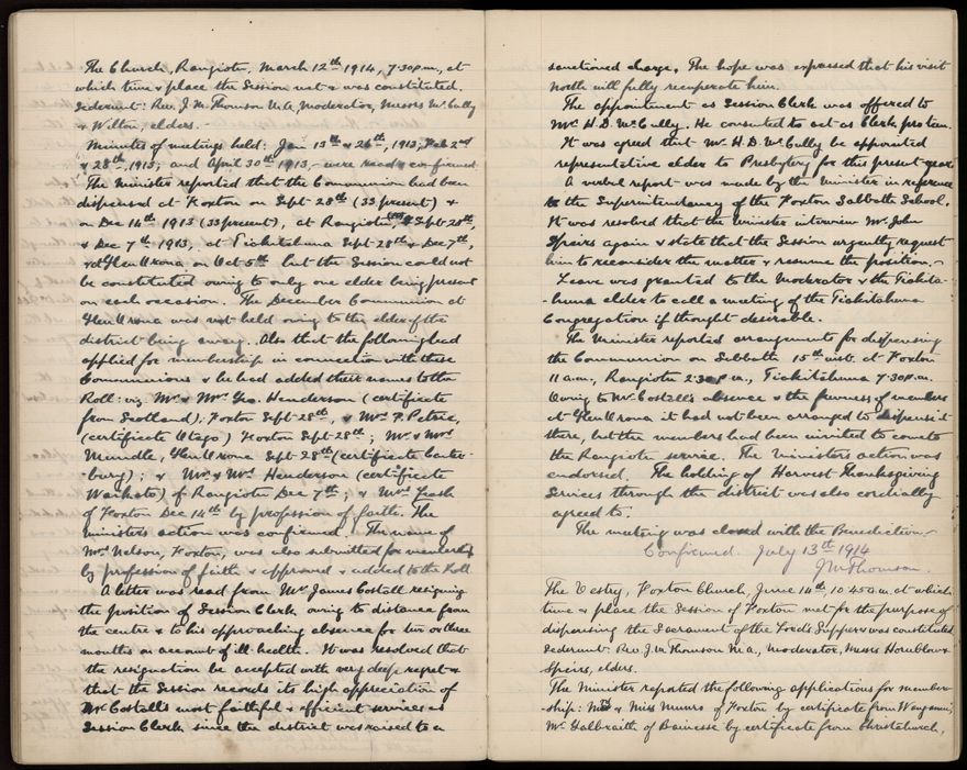 This baptismal register was for the Foxton Presbyterian Church. The register also includes Communion Rolls of Foxton 1907-15, Oroua Bridge 1909-15, Glen Oroua 1909-15, Tiakitahuna 1909-13, and Session Minutes 1909-1928.