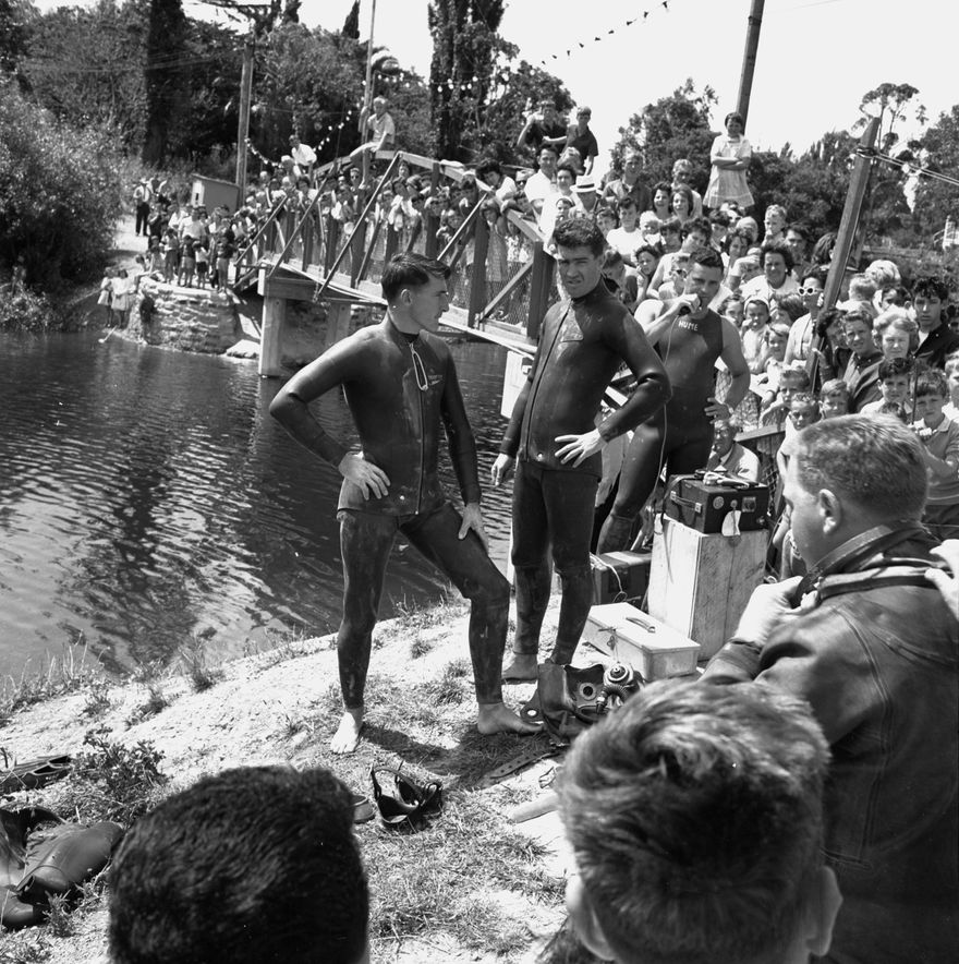 A midsummer festival named “Carnival of the Lake” was held on the Hokowhitu Lagoon at Centennial Drive, Palmerston North, January 17th – 20th 1964. A variety of activities ensured the public were well entertained during the four day festival. Here, three Navy divers, from a party of five, tested equipment as part of their display at Centennial Lake [Hokowhitu Lagoon]. They were all members of the Royal New Zealand Navy Diving School based at HMNZS Philomel. The Carnival of the Lake was organised by the Palmerston North Public Relations Organisation and held over Anniversary Weekend in 1963 and 1964.