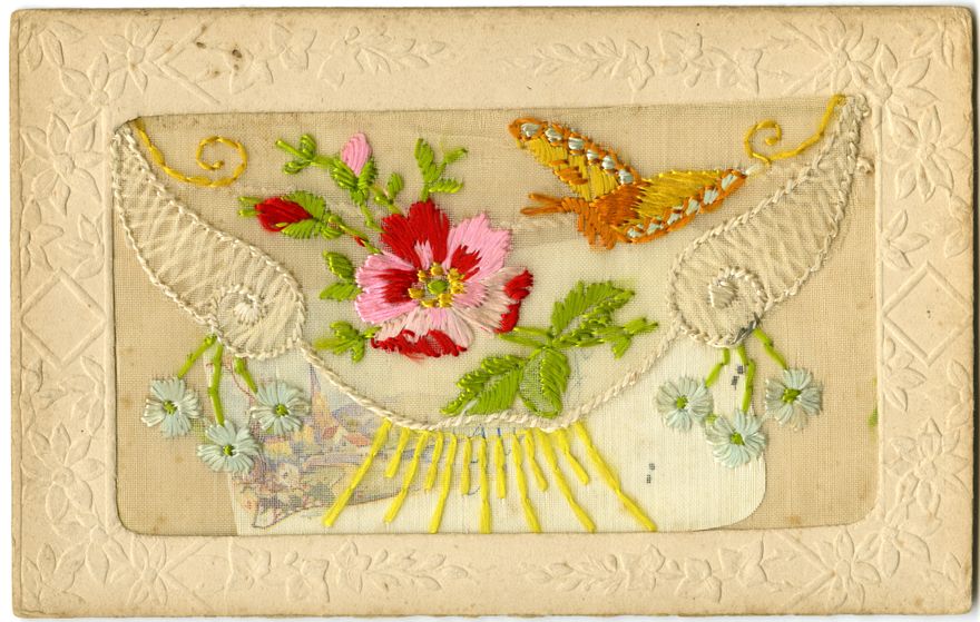 The postcards in this series are all hand-embroidered, some of them have writing on the reverse, while others contain smaller decorated cards in the silk pouch on the front.