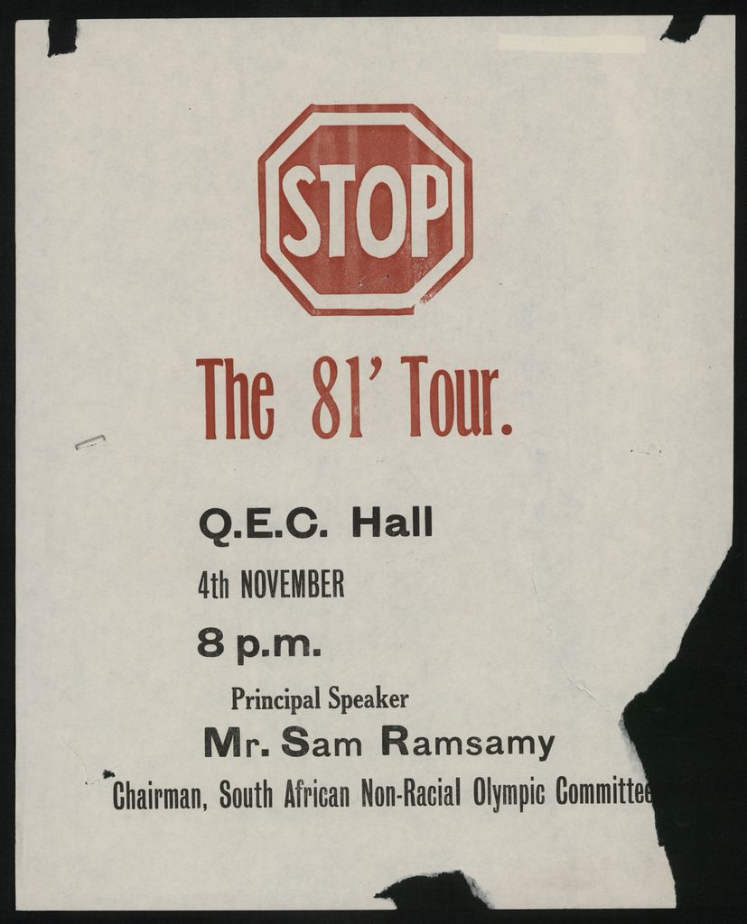 Stop the 81' Tour. Q.E.C. Hall. 4th November. 8 p.m. Principal Speaker Mr. Sam Ramsamy, Chairman, South African Non-Racial Olympic Committee'. This poster relates to the 1981 Springboks rugby tour of New Zealand. There was considerable protest against the South African team playing throughout New Zealand. A game was held in Palmerston North. Part of a collection of posters that were displayed in the Public Library in the 1970s - 1980s.