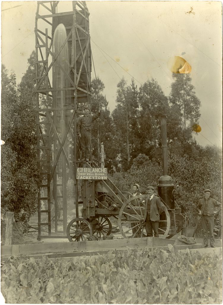 - This artesian well, on John Nairn’s property, was the first well bored in Palmerston North. Water was found at 210 feet and was used to water the Nairn’s glasshouses. The bore was situated between Nairn’s house and College Street in what is now Nairn Crescent. John Clark, 3rd from right, worked for John Nairn for many years and was active in the Salvation Army. The other men are thought to be from the boring firm of G H Blanche.