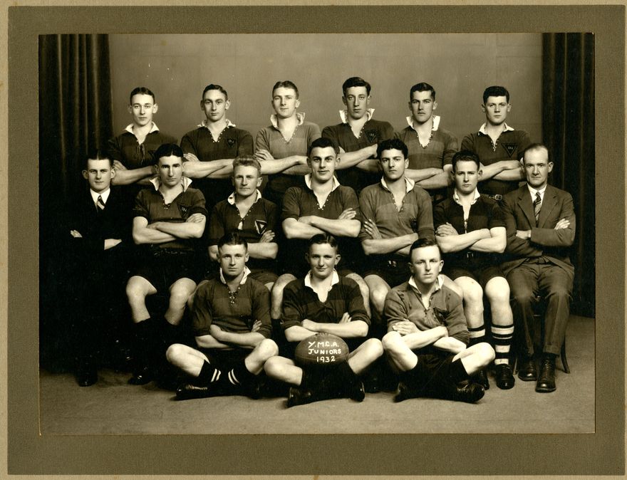 The 1932 Palmerston North YMCA Junior Rugby Team. Alan Tillick is second from the left in the middle row. All other players are unidentified.