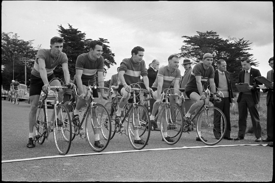 Unknown cyclists prepare to race for the Hope-Gibbons Shield.