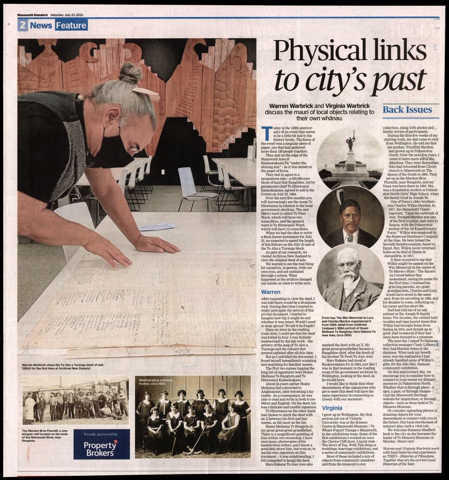 Local historians weekly "Back Issues" article in the Manawatū Standard. The 158th anniversary of the 250,000 acre block of land sale that Rangitanē agreed to sell to the Crown is on July 23 1864. The deed of sale is held in Archives New Zealand, Wellington. This article describes the authors experiences of viewing the original deed, and their whanau connection.