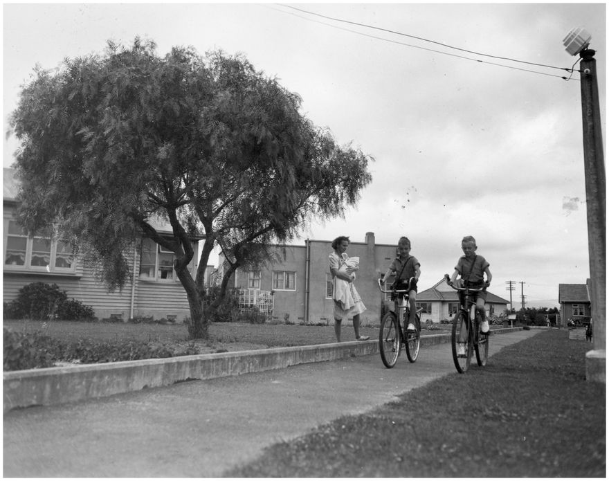 A photographic series prepared by the Prime Minister’s Department in 1947 to attract British migrants. The Evans family of 5 Mansford Place, Palmerston North were selected to show the living conditions of a typical New Zealand family. Betty Evans and baby sees John and Michael off to school. The family had two bikes which were in general use at this time. Betty and Jack Evans biked to work and the boys usually walked about a kilometre to West End School which adjoined the state housing suburb. The family bought a Model A Ford in the 1950s. There were also two younger boys in the family, Tony and Wayne. The baby is Julie Silvester, a neighbour’s baby, chosen to create a picture of the ‘typical’ family of two or three children.