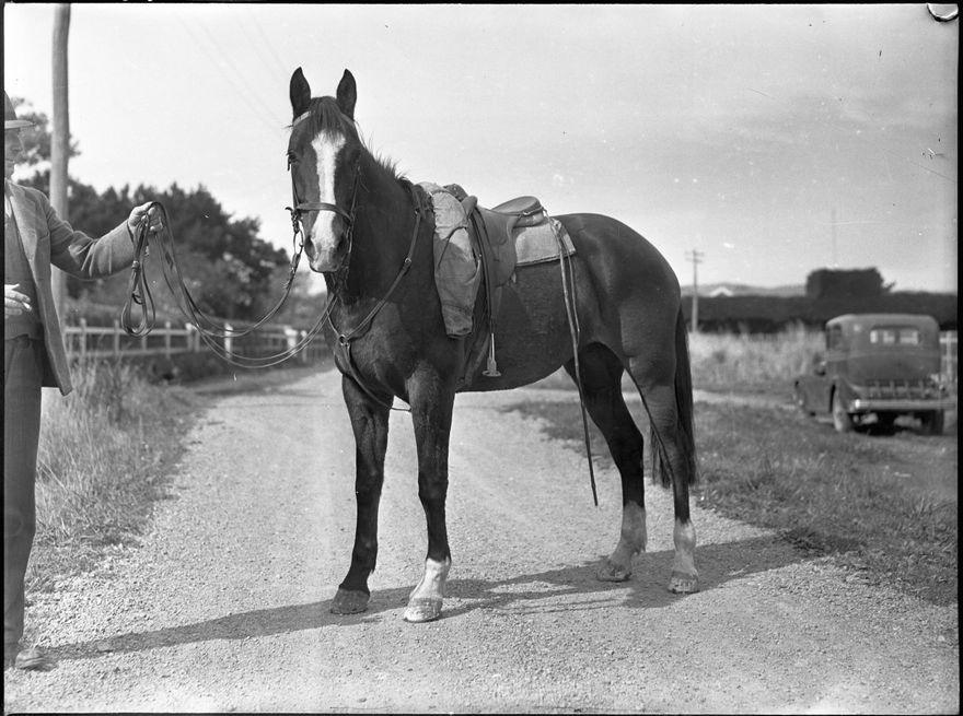 The original negative of this photograph is entitled ‘Mullin’s horse, Longburn’. An W R Mullins is listed as a farmer in Palmerston North rural in the 1950s (Wises Directory)