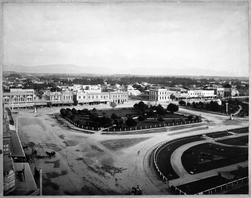 Building, from left: [1] Victoria Buildings - built in 1901, demolished c 1928. [2] Bradfield, "The Cash Grocers" [3] The Crown Studios, Whalley and Co. Photographers [4] W Pegden, furnishing warehouse. Established in 1882 by Simmonds and Pegden and continued alone from Pegden alone from 1888. Destroyed by fire in 1891. [5] J A Nash and Co - General Merchants. [6] DM George, draper and clothier [7] Occidental Private Family Department - built c1897; ?; Hood Chemist; Ridley's Tea Depot; ?; Bert Pratt, Hairdresser [8] Occidental Hotel - built c1897, destroyed by fire c1927 [9] Bank of New Zealand, built in 1902 [10] Mellsop, Elliott and Co, - Manawatu Land Agency. [11] T Parkins, butcher [12] Malcolm, "Furnishing Company Ltd". [13] Manawatu Evening Standard - built 1891. The Standard was here from 1903-1910. [14] E O Olsen, Tailor [15] Borough Council Chambers [16] All Saints Anglican Church. The building with a dome, in front of the Evening Standard building, is an observatory.