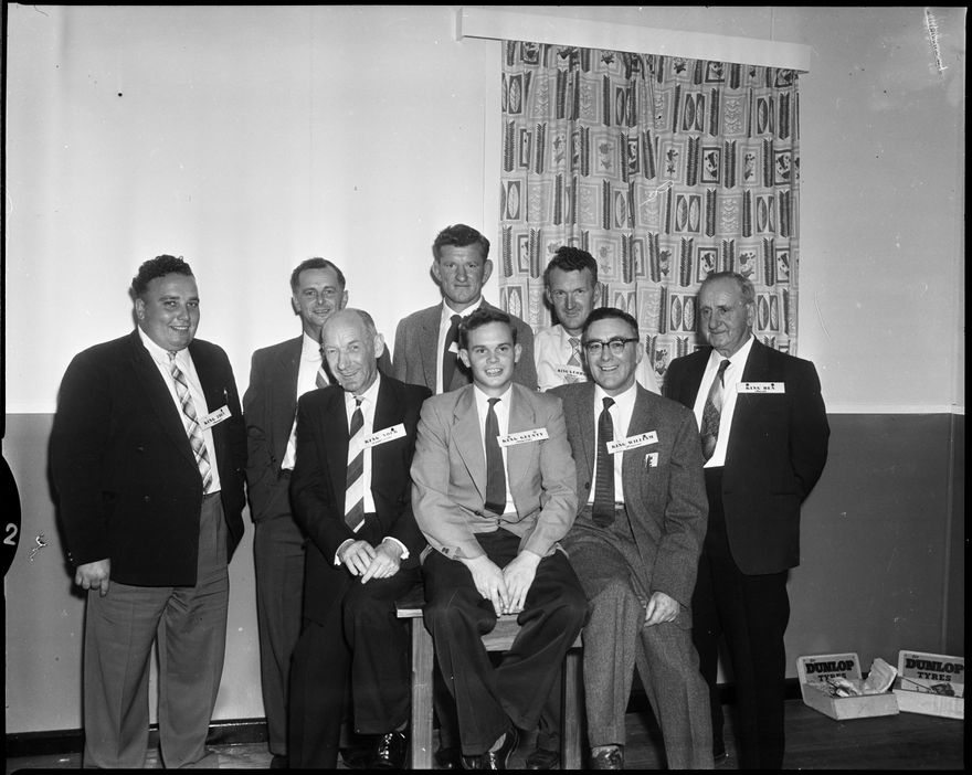 [Eight men in a group with boxes of Dunlop Tyres advertising]