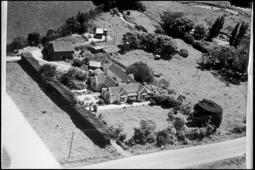 The Vautier Homestead and outbuildings in the late 1950s with Stoney Creek (Matai Stream) in the background. Compare the sprawling layout of the house with original portion shown in 2014N_Wh31_009198. The barn is original, dating from the later 1870s.