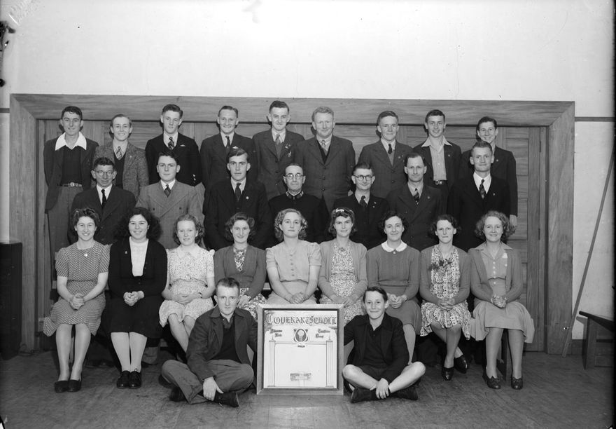 The Salvation Army established themselves in Palmerston North in 1884. The framed item in front of the young adults reads, " Covenant Scroll - Palmerston North Torchbearer Group" and a piece of scripture.