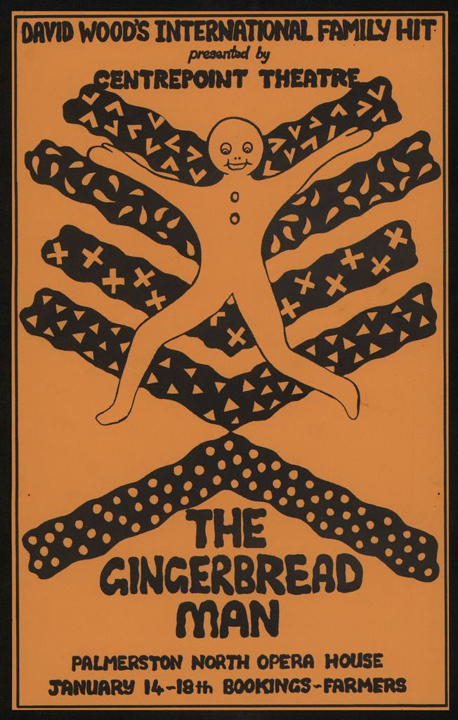 "David Wood's international family hit presented by Centrepoint Theatre. The Gingerbread Man. Palmerston North Opera House. January 14 - 18th. Bookings - Farmers." Part of a collection of posters that were displayed in the Public Library in the 1970s - 1980s.