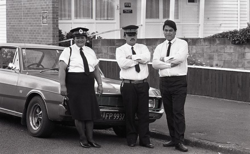 This image was taken as part a feature that ran in the Manawatu Evening Standard on January 17 1987 about the work of Māori Wardens in Marton. According to the story that accompanied the photographs, Māori Wardens were instituted in 1937 and by 1987 there were 2300 working voluntarily throughout in New Zealand under the jurisdiction of the Māori Wardens' Association. Before receiving their badges and warrants, trainee wardens underwent an 18 month probationary period, taking training from senior wardens and the district wardens' associations.