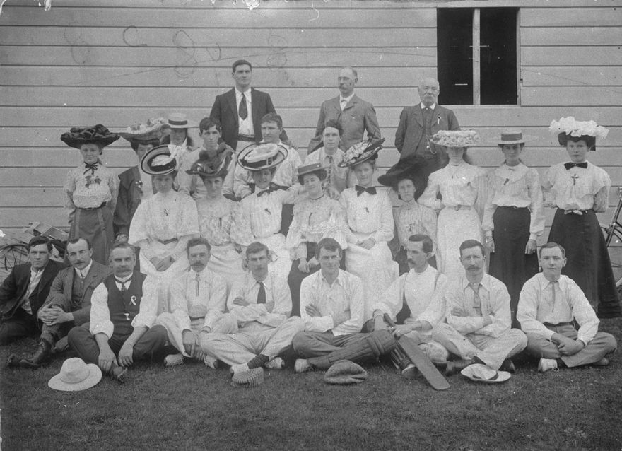 Some of the male staff are dressed for a cricket game. From left: Back row; Unknown, ? Wallace, Manager; Alex Ross, brother of C M Ross. Front row: Unknown; Mr Ovenden, Tailor; Unknown; Vernon Farquhar, Buyer Haberdashery; Unknown; N McPherson, buyer; A H Mills, Buyer; Unknown; Alf Allen, who worked for C M Ross in Palmerston North and later bought out C M Ross’s Levin shop.