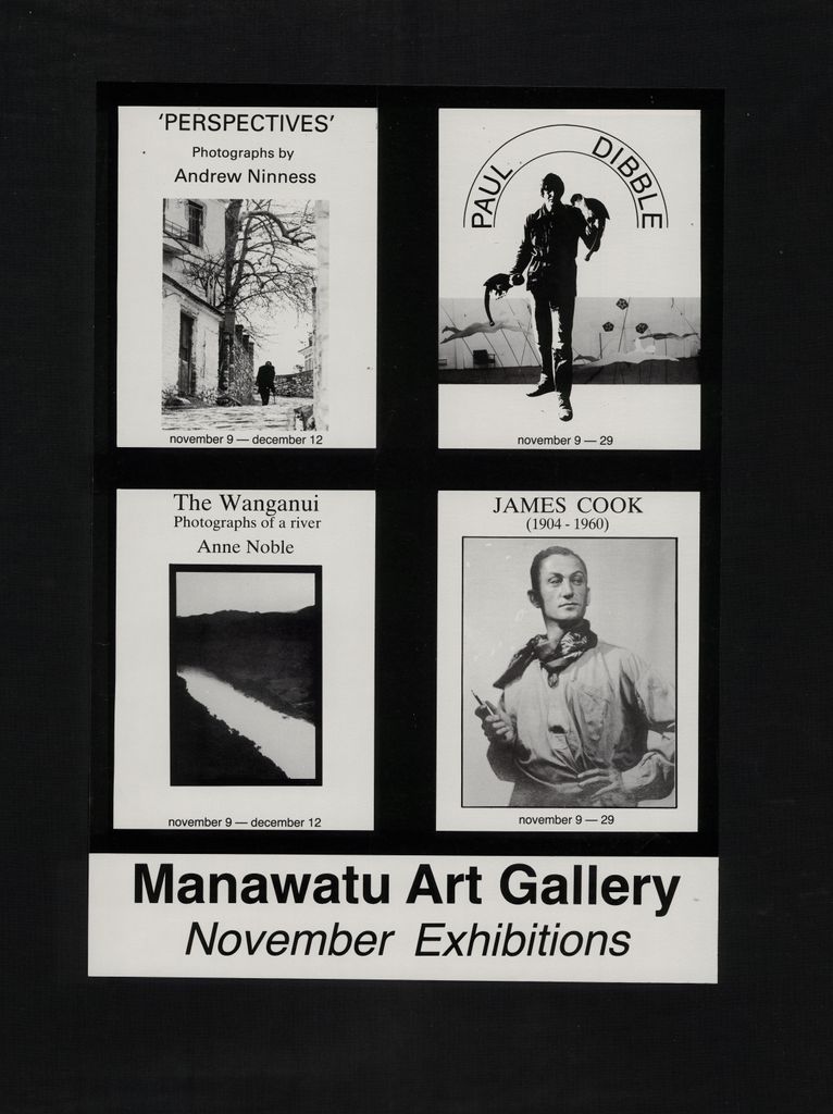 Poster advertising November exhibtions at the Manawatu Art Gallery. 'Perspectives, Photographs by Andrew Ninness, november 9 - december 12. Paul Dibble, november 9 - 29. The Wanganui, Photographs by Anne Noble, november 9 - december 12. James Cook (1904 - 1960), november 9 - 29'. Part of a collection of posters that were displayed in the Public Library in the 1970s - 1980s.