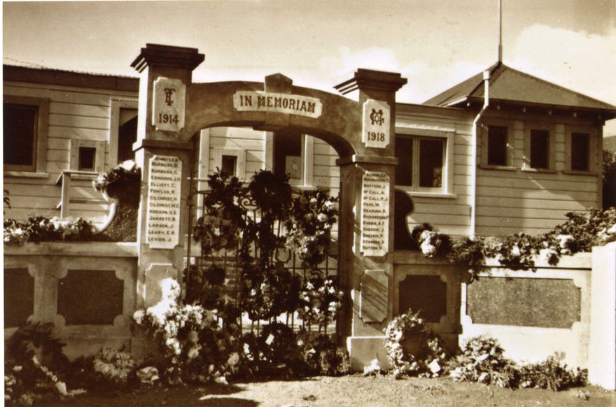 The memorial gates at Terrace End School during ANZAC Day commemorations.