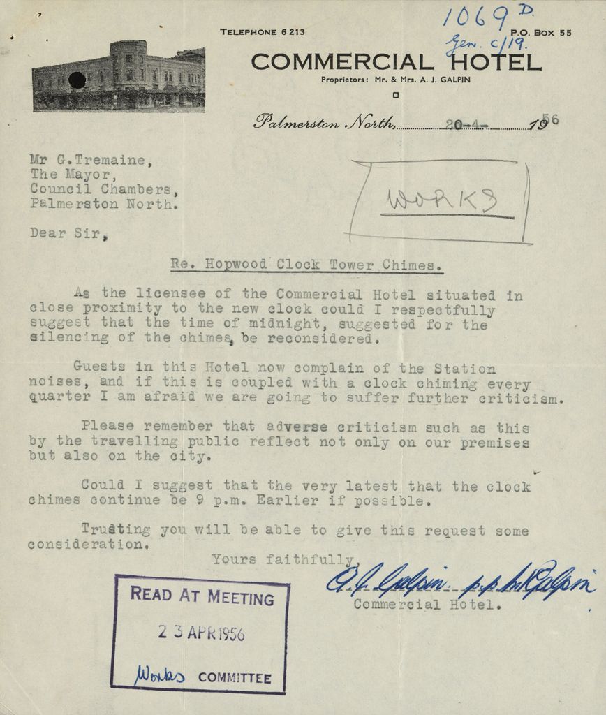 The Commercial Hotel, situated on The Square, Palmerston North, wrote to suggest that the clock chimes be silenced during evenings and nights, in consideration of their guests. The letter was considered by the Palmerston North City Council Works Committee.