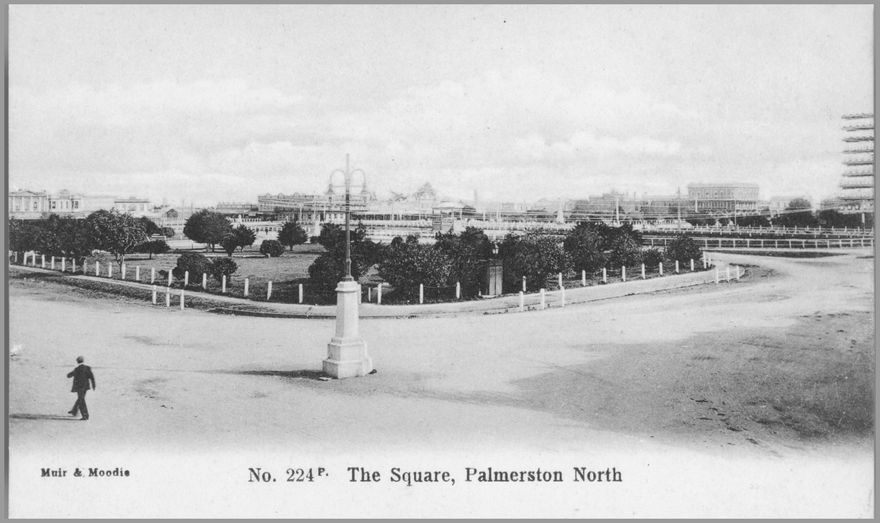 The east section of the gardens are in front, with the statue of Te Peeti Te Awe Awe behind (built in 1907). The Clarendon Hotel is on the back right on the photo (rebuilt in 1904)
