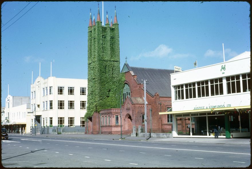 Looking down towards the corner of The Square, showing: Palmerston North Council administration building (now Square Edge); All Saints Church; Justice and Edmunds Ltd