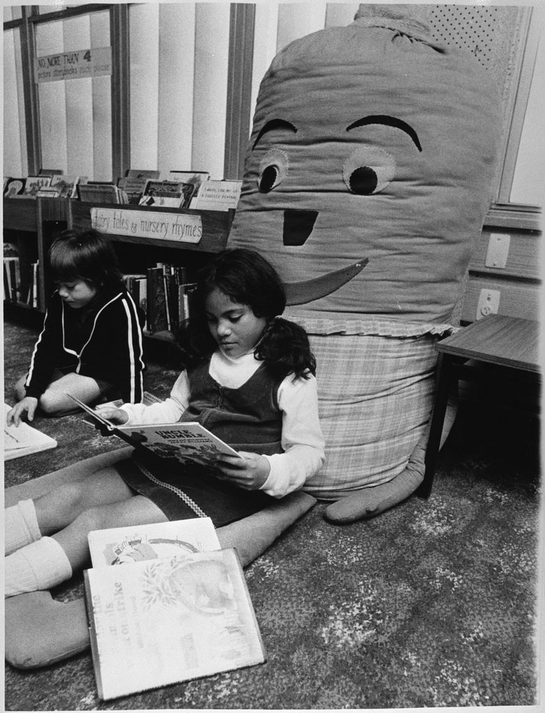 Margaret Mansell reading in the Children's area of the Palmerston North Public Library on the corner of Main Street and The Square