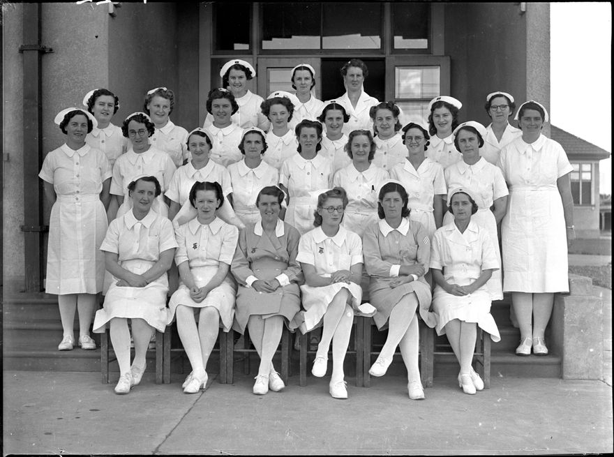 An group of unidentified nurses. It appears to be a group of registered nurses and others with a red cross on their headwear.