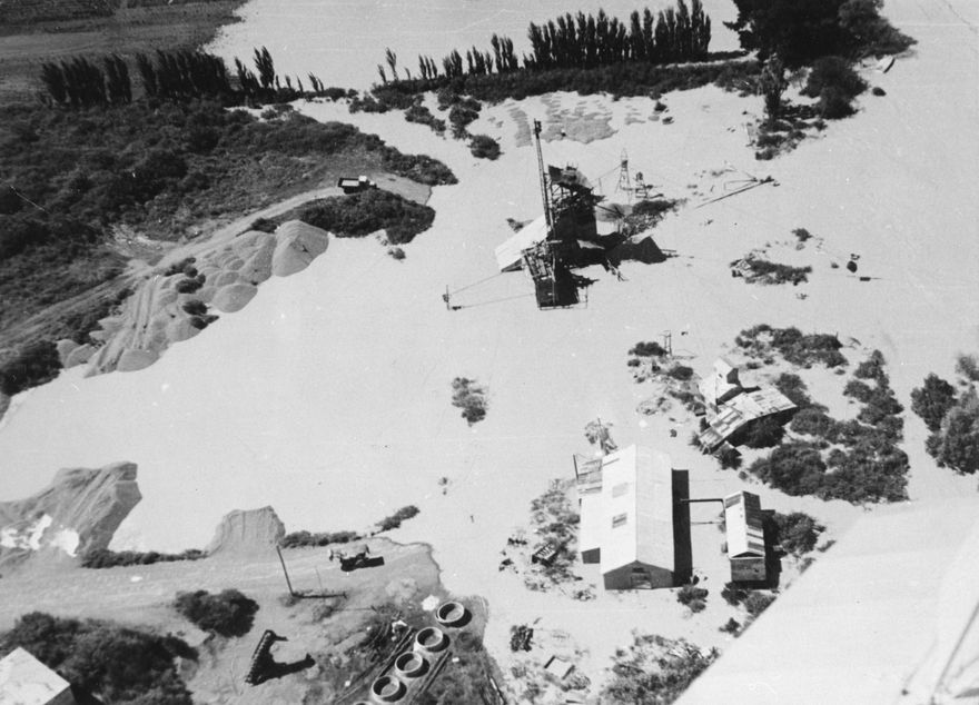 An aerial view of Child Brothers metal crushing plant during the great flood of 1953. Child Brothers Ltd, Carriers and Fuel Merchants, was established in 1919 by Edward G Child and his sons, W J Child & E W H Child. They opened the metal crushing depot and plant at the end of Albert Street near the Manawatu River c1927. The business later became known as Child Metal Ltd.
