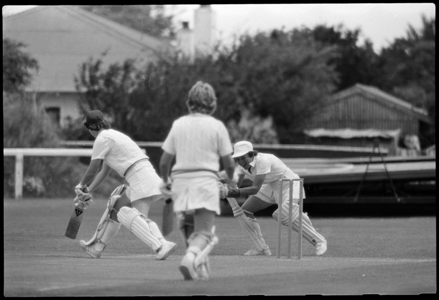 This image was taken (but not used) by the Evening Standard on 20th of January 1982 and published on the 21st. It depicts the Australian women’s cricket team taking on the International XI women’s team in a limited over match for the Hansell's Vita Fresh Women's World Cup 1981/1982. The match was held at Fitzherbert Park in Palmerston North. The Australian team won by 64 runs.