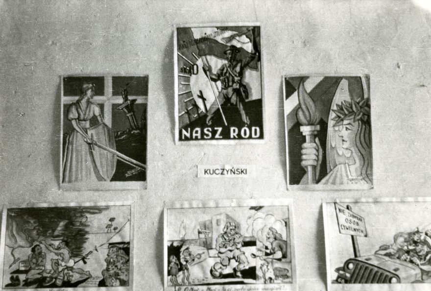 Exhibition of gifts to be sent to New Zealand, as displayed at Cupra Marittima, italy, during World War Two. This image shows some of the paintings and cartoons by Kuczynski. The gifts were made by Polish soldiers to give to New Zealand as an expression of their heartfelt gratitude for New Zealand's treatment of the Polish children refugees and appreciation of the great friendship shown to the soldiers through the sending of correspondence and parcels, during World War Two.