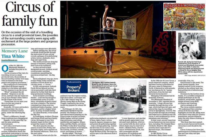 Journalist Tina White's weekly "Memory Lane" article in the Manawatū Standard. A look back at some local circus history, as reported in the newspaper. Travelling circus visits to Palmerston North have been reported since 1909, and have continued to the present day.