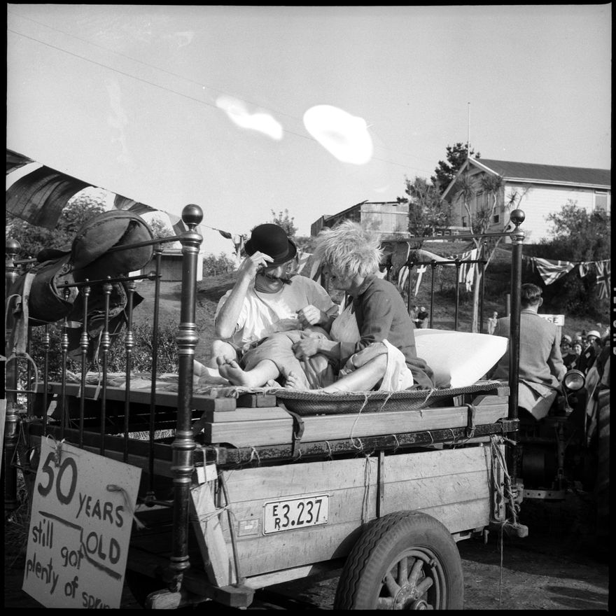 [Two people in pyjama costumes sit on an old bed on a tractor trailer. A sign reads "50 years old. Still got plenty of spring."]
