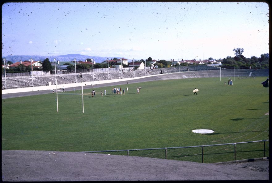 Memorial Park (previously named Fitzroy Park) at Terrace End, was formerly a metal pit used by the Railways Department for ballast, from about 1876-1937. The Palmerston North City Council purchased the 21 acre site in 1938 and developed it into a recreational and sporting area. A WWII memorial was erected 1952 and in 1954 Fitzroy Park was officially dedicated as Memorial Park. In 1983 the obelisk was removed and now the gates stand as the official memorial. Photograph was published in The Tribune 20 April 1975.