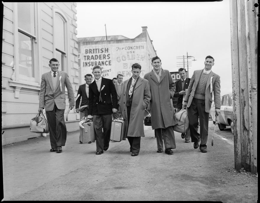 This image was taken for a story that ran in The Manawatu Evening Standard on 5 September, 1959. "Members of the Manawatu representative hockey team which leaves the city today for Christchurch are seen gathering outside the Post Office. Manawatu met Canterbury today for the New Zealand Shield, the Dominion's premier hockey trophy. From the left to right are: M. Morgan, B. Hopkins, L. Henderson. B. Yulle, C. Proctor, R. Green, P. Davis and N. Millington."