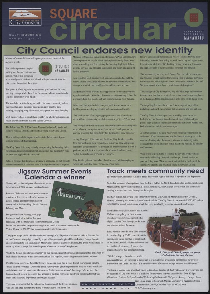 The Square Circular was Palmerston North City Council's monthly community publication, informing Palmerstonians of PNCC initiatives, activites, and events. This month's issue includes: logo; branding; Summer events calendar; athletics track; walkway; birthright; toys day out; festival of Manawatu; annual report; ward committees; convention centre; Ashhurst library; library; Fitzherbert park; car parks; bus station; drainage inspections; environmental education; environmental trust; green bike trust; zero waste trust; recycling; Creative Sounds;