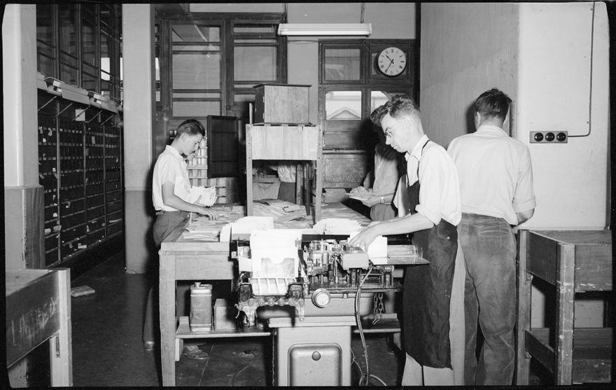 This image was taken for a story that ran in The Manawatu Evening Standard on 24 December 1958: "During the Christmas mail rush the Post Office staff is working round the clock. The machine seen here, a cancellation and date stamping machine, created a record on December 16 when 123,910 letters were cancelled."