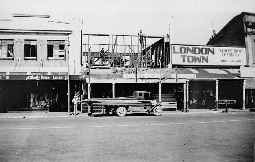 A building under construction in 1935 for Leary’s Pharmacies Ltd, to replace the original building built by Richard Leary in 1885. Richard Leary established his business in 1875 and continued in business until his death in 1901. A J Graham, an employee of Leary's, took over the management of the pharmacy in 1902 and continued its operation until 1927 when a company, “Leary’s Pharmacies Ltd”, was formed in conjunction with Messrs J K Paton and R L C Aitchinson.