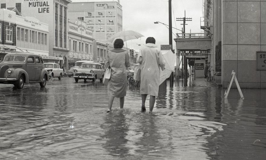 Caption: "These two girls didn't mind walking through the water when crossing King Street."