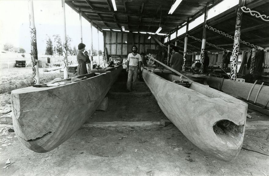 Head carver Greg Whakataka stands between the two canoe hulls at Pahiatua before they were shifted to Porirua. The Pahiatua Marae Association were the original hosts of the project to build the Aotearoa-Hawaiiki waka, begun in December 1979. In 1980 the decision was made to complete the waka at a carving school in Porirua. The double-hulled waka was made to traditional standards and in 1985 sailed the traditional route of Te Arawa - Tainui from Tahiti to Rarotonga then south-west to Aotearoa.