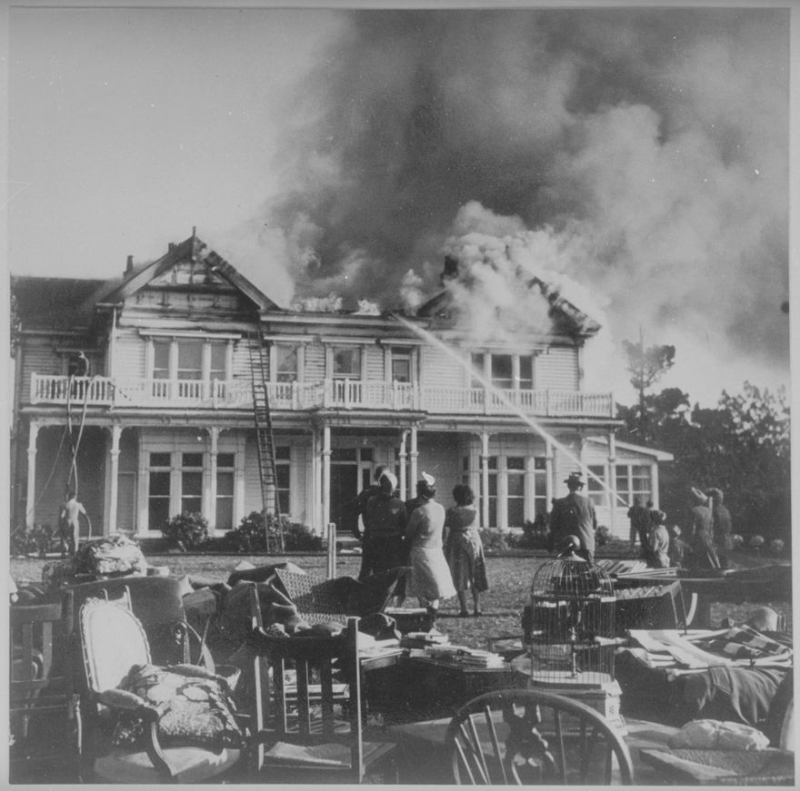 On 12 June 1961, Mr C M A Kebbell's two-storey home near Ashhurst was badly damaged by fire. Furniture and other personal effects were retrieved from the house by neighbours and firefighters, until the strengh of the fire became too severe.
