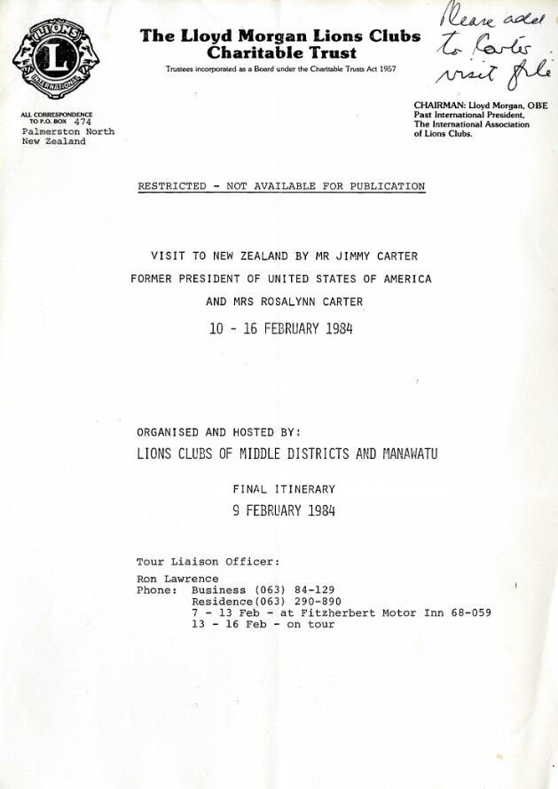 Itinerary for visit to New Zealand by Mr. Jimmy Carter, former President of the United States of America, and Mrs Roselynn Carter