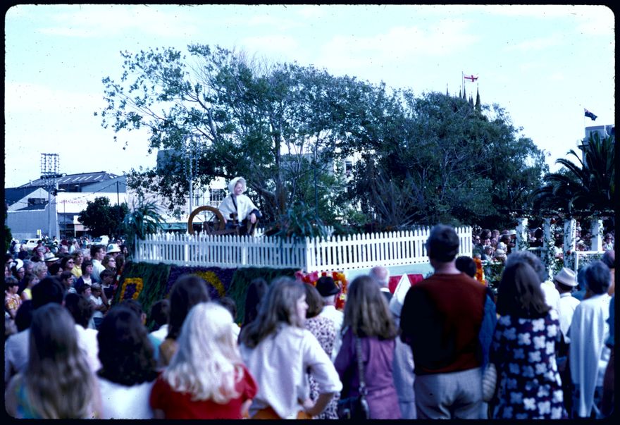 A woman wearing the costume of a pioneer, complete with a spinning wheel, sits atop the Palmerston North City Council Float. The front of the float has "PNCC" written in flowers. 92 floats took part at the Palmerston North City Centennial celebrations of 1971. Approx. 10,000 people were present at the event to celebrate 100 years of Palmerston North.